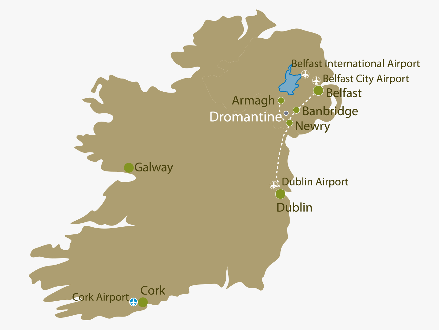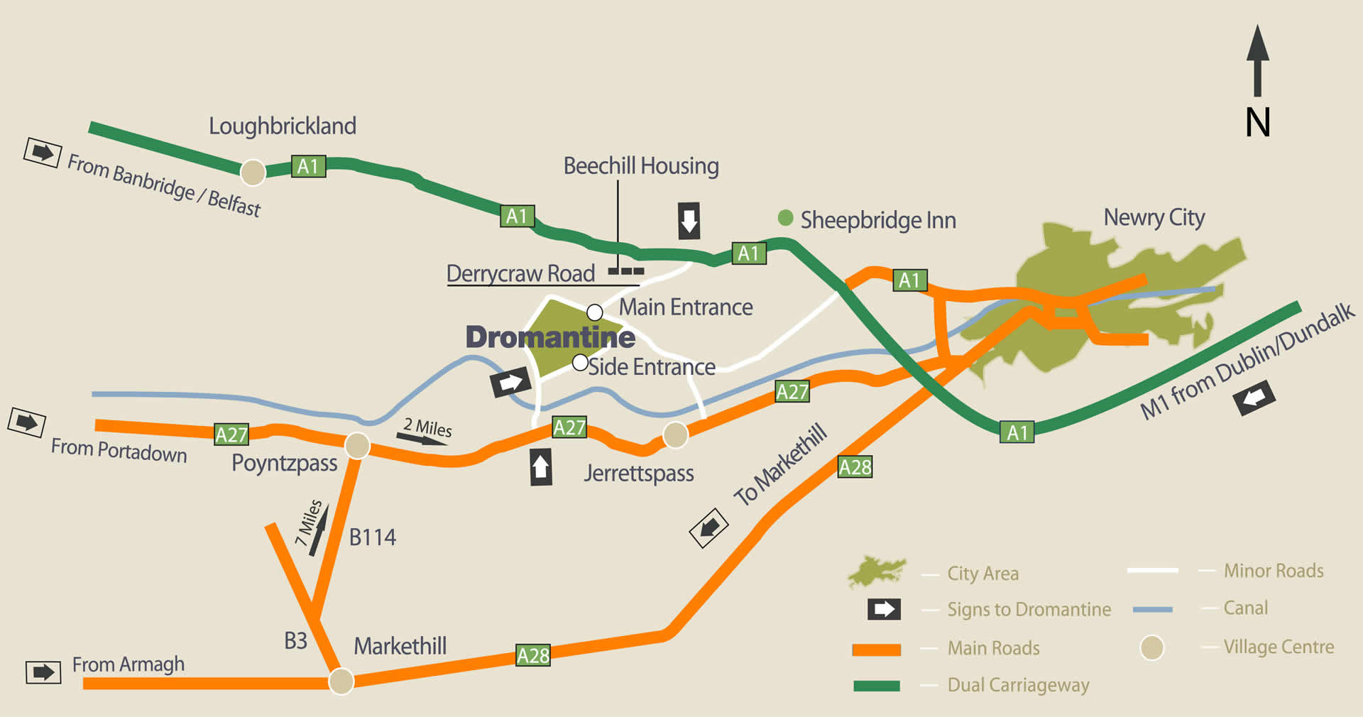 The main roads to take are the A1 Motorway (Leave Belfast M1 at Sprucefield for Newry) or if travelling from the west the A27 (Portadown/Tandragee/Newry).